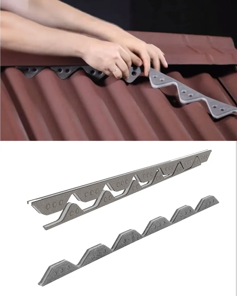 Предназначен для защиты подкровельного пространства от ветра, снега, мелкого мусора и пыли, от проникновения птиц: устанавливается в просветах, которые образуются между битумными листами и обрешеткой или другими кровельными элементами на хребтах или на карнизах крыши. В случае необходимости может участвовать в устройстве вентиляции кровли и отведении конденсата: в этом случае при укладке заполнителя в нем нужно проделать отверстия, которые уже нанесены методом перфорации. Поэтому выдавить отверстия можно обычной отверткой.